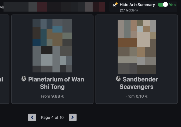 - Sites: www.despelvogel.com. Adds 'Cardmarket' button to each card that opens Cardmarket search in another tab. Shows the price on Cardmarket for easy checking if a good deal.
